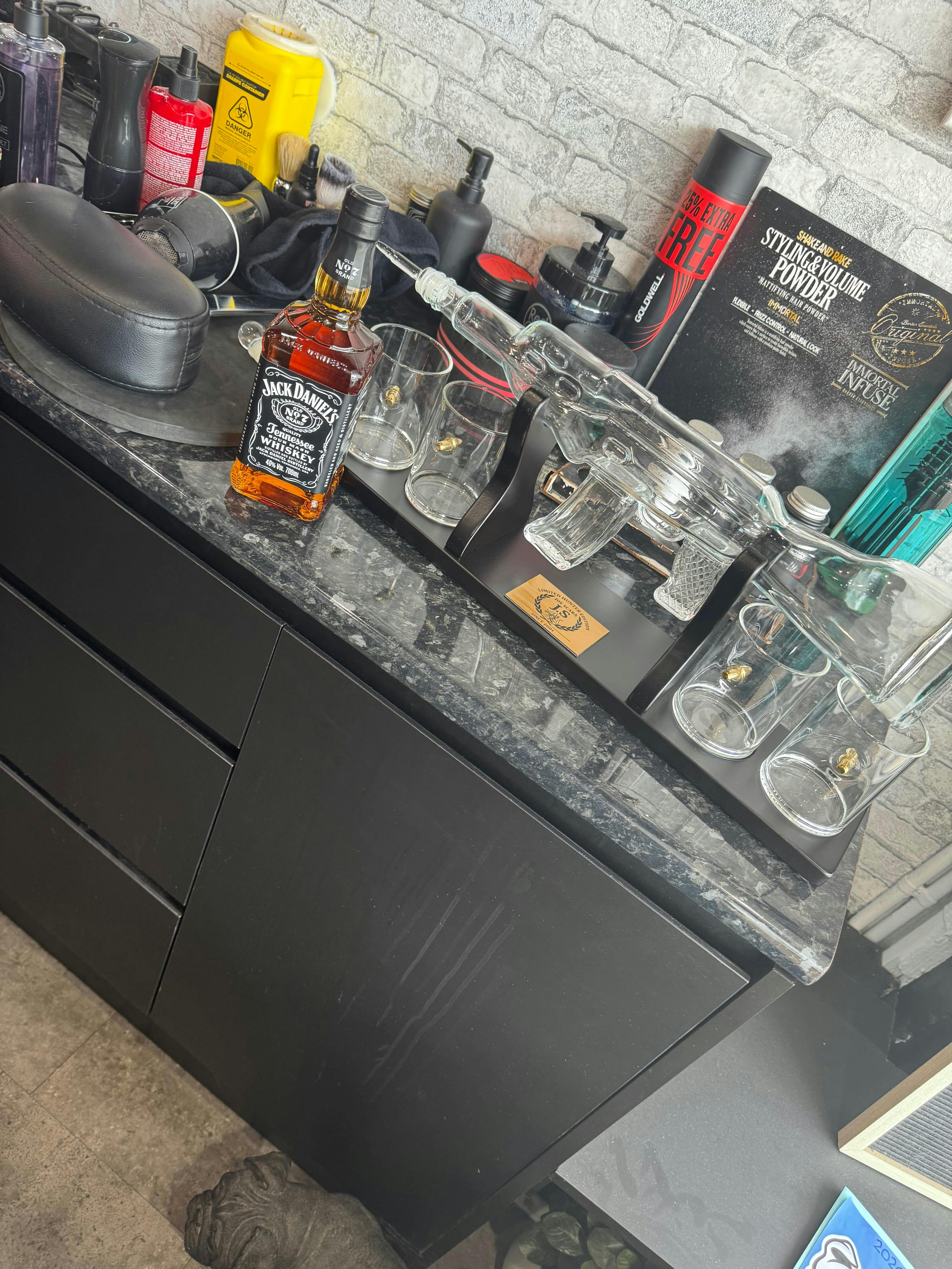 Elevate your bar with this exquisite rifle whiskey decanter and its accompanying bullet glasses. With its intricate design and rustic theme, this decanter is a true testament to any whisky connoisseur’s status.